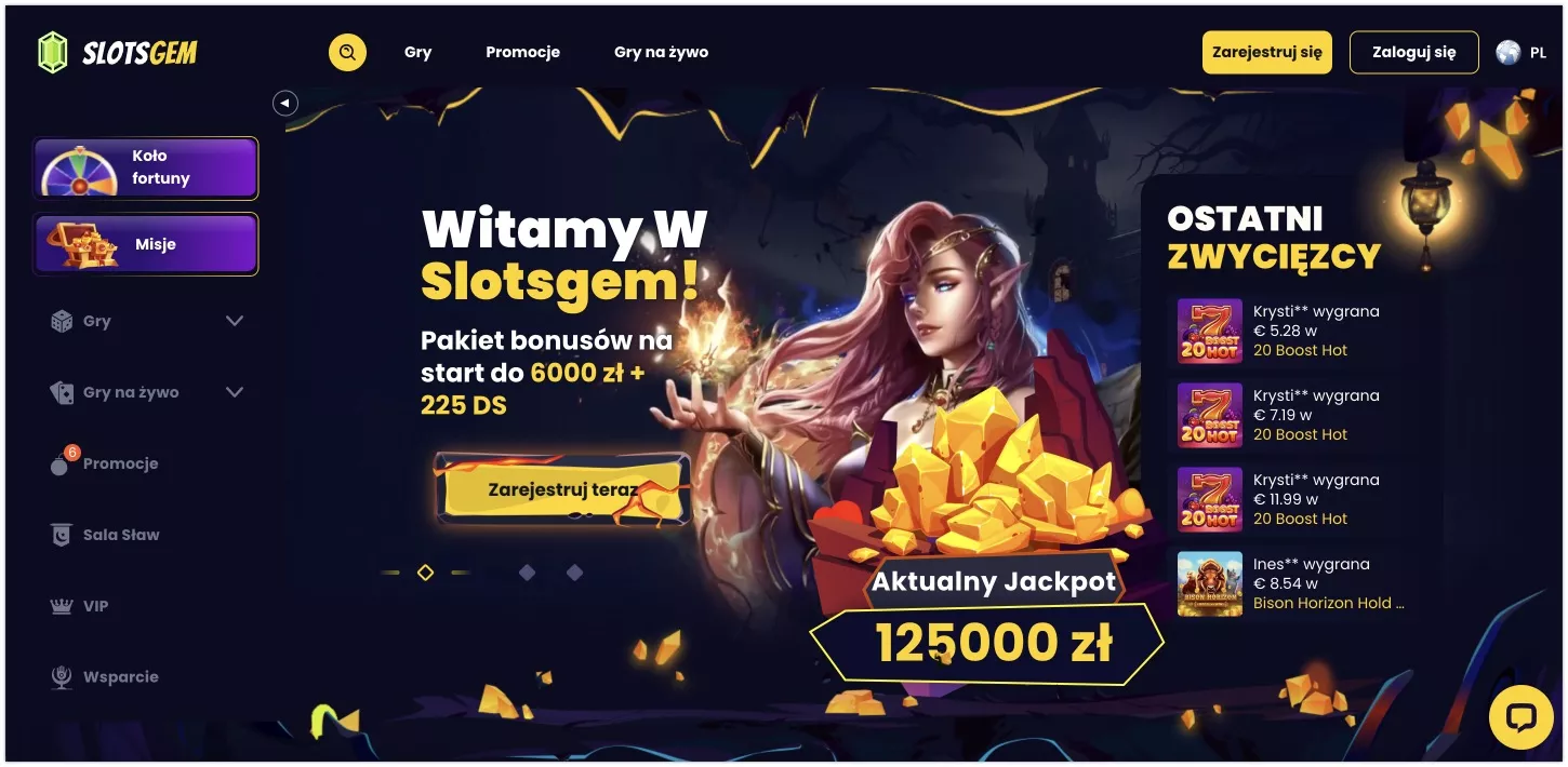 SlotsGem to nowoczesne kasyno online, założone w 2024 roku, które należy do firmy LATCAS B.V. Kasyno oferuje polskim graczom szeroki wybór gier, w tym ponad 10 000 tytułów, oraz atrakcyjny pakiet powitalny, który może sięgnąć nawet 6000 PLN i 225 darmowych spinów. Dodatkowo kasyno wyróżnia się wyjątkowym programem VIP, który posiada aż 50 poziomów, oraz różnorodnymi misjami i osiągnięciami, które umożliwiają graczom zdobywanie nagród. W tej recenzji kasyna SlotsGem dla polskich graczy w 2026 roku przyjrzymy się szczegółowo temu, co oferuje ten operator i czy warto zarejestrować się na platformie.