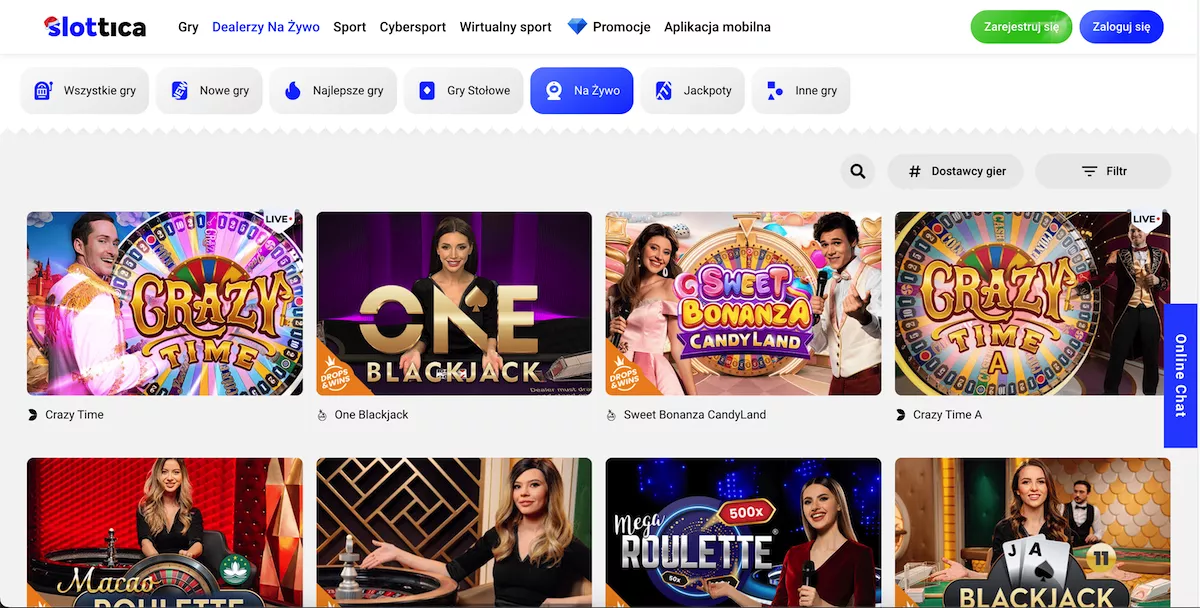 Graj w kasynie online Slottica na prawdziwe pieniądze, testując możliwości tutejszych gier na żywo. Ogólnie polski usługodawca zapewnia dostęp do kilkudziesięciu odmiennych gier na żywo. Wśród nich gracze mogą spotkać ruletkę, blackjack, poker, teleturnieje, bakarat i sporo innych, nieco mniej znanych, gier. Obecnie największą popularnością wśród klientów kasyna cieszą się takie tytuły, jak: