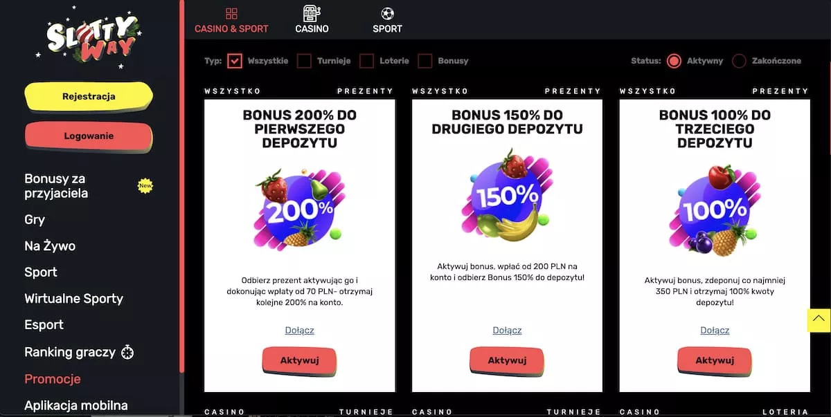 Pierwsze wpłaty w kasynie SlottyWay wiążą się z pakietem bonusowym. Nowe bonusy w kasynie SlottyWay 2026 na start obejmują teraz trzy pierwsze depozyty i można je wykorzystać zarówno w kasynie, jak i u bukmachera.