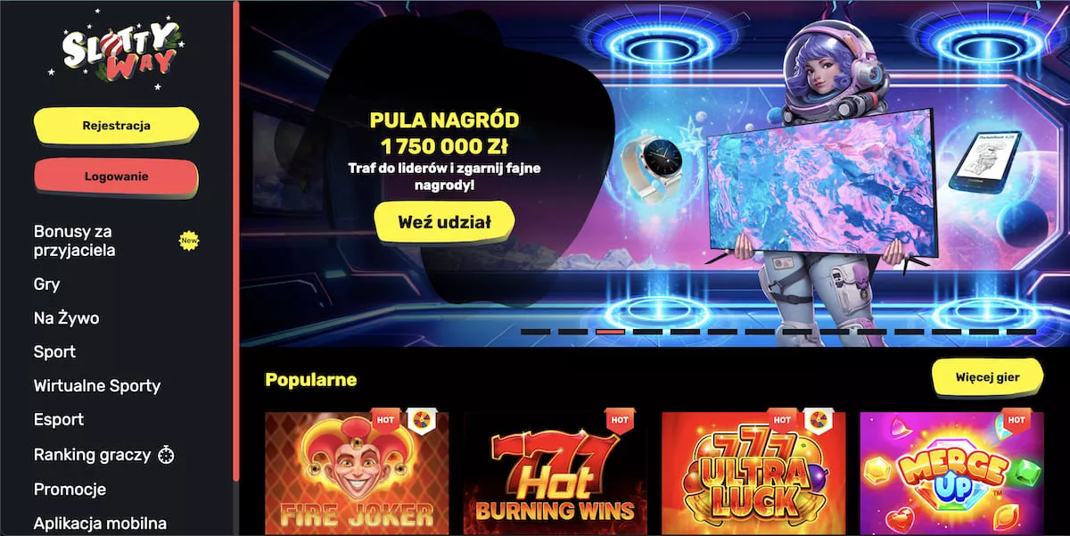 Nasza recenzja SlottyWay kasyno online w Polsce 2026 zaczyna się od kluczowych informacji. Niżej zapoznacie się też z prawdziwymi opiniami kasyna SlottyWay. Platforma jest dostępna w języku polskim dla lokalnych graczy. Graj w kasynie SlottyWay online na prawdziwe pieniądze i zdobywaj mega wygrane.