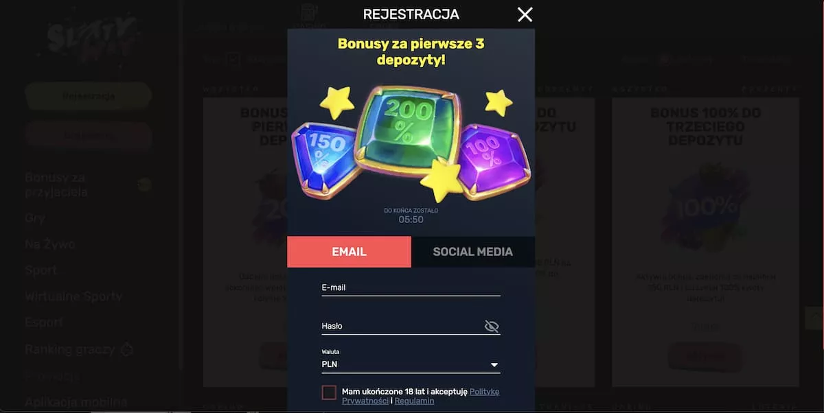 Otwieramy oficjalną stronę online kasyno SlottyWay w Polsce 2026 i klikamy w żółty przycisk rejestracja. Wprowadzamy adres e-mail/telefon/social media i wybieramy hasło.