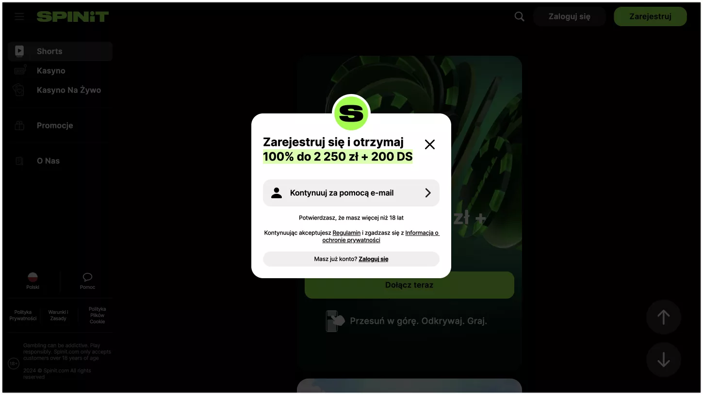 Odwiedź serwis hazardowy oraz naciśnij przycisk rejestracji w prawym górnym rogu. Na początku możesz aktywować Spinit kod promocyjny.
