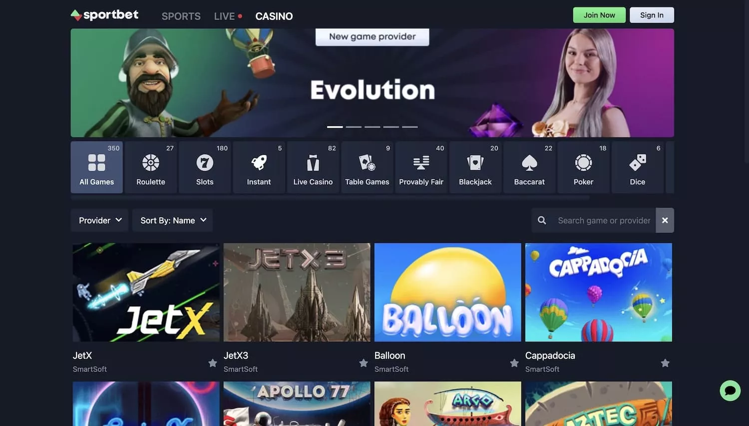 W Sportbet casino gry są podzielone na tradycyjne kategorie, czyli na: