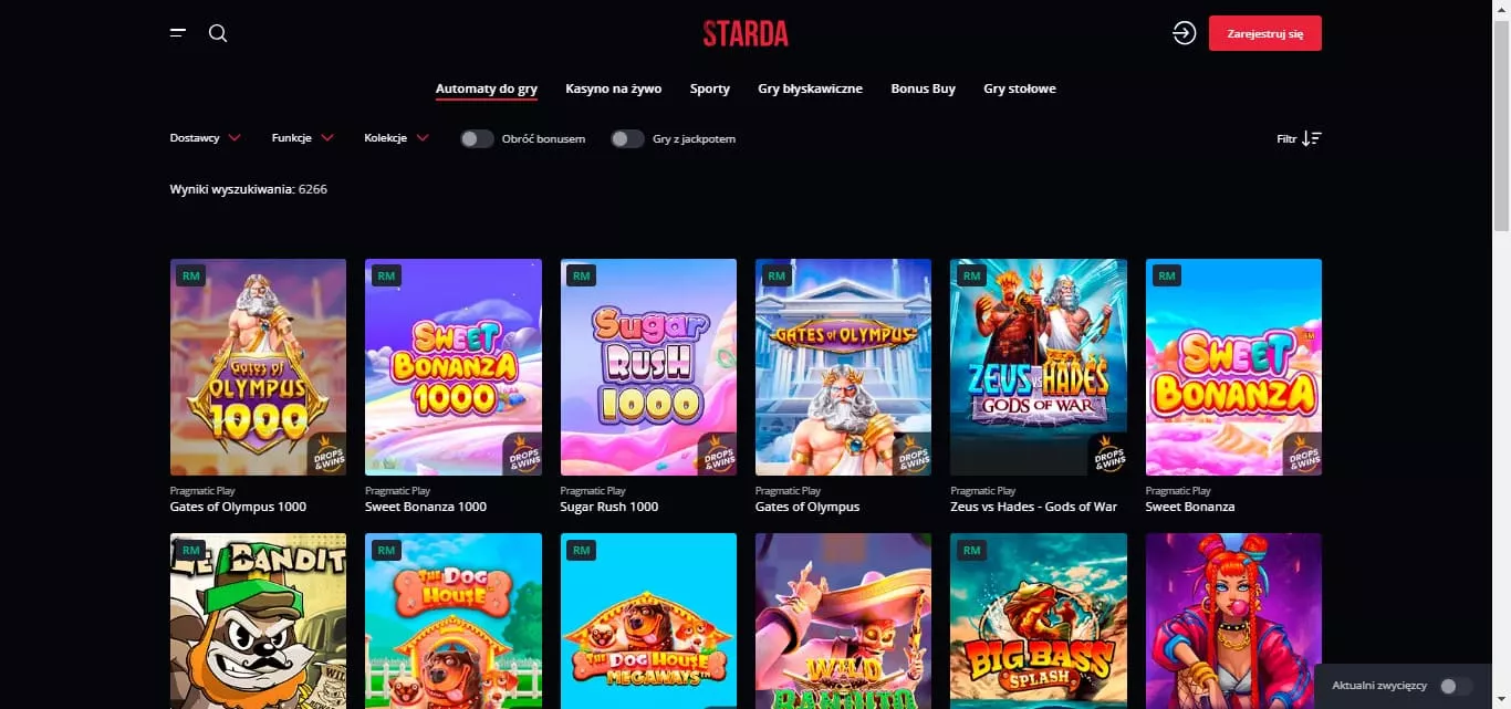 Sekcja gier w Starda na prawdziwe pieniądze jest bardzo rozbudowana. Jeśli chodzi o liczbę dostępnych gier, to jest ich obecnie aż 10000, a ich liczba stale rośnie. Znajdziemy tu takie gry jak na przykład: