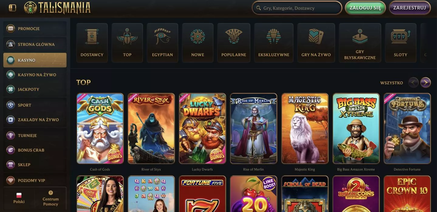 W bibliotece Talismania znajdziemy prawie 10 000 tytułów. Gry kasynowe podzielono na kategorie widoczne w poziomym menu głównym. Użytkownicy mają dostęp do sekcji z kasynem oraz bukmacherem umieszczonych niżej w menu bocznym.