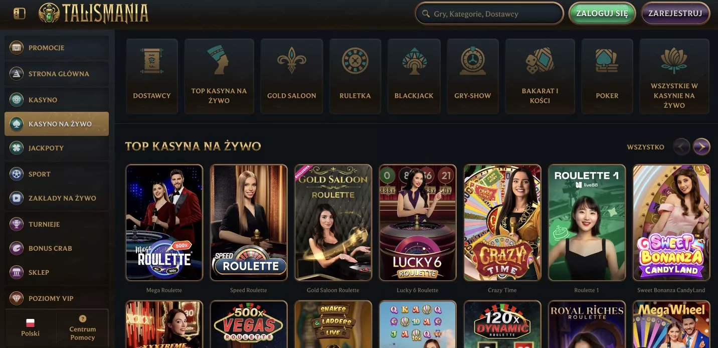 Kasyno na żywo Talismania obejmuje setki stołów prowadzonych przez dealerów z Pragmatic Play Live, ELA Games oraz OnAir. Gracze mają dostęp do klasycznych wariantów gier na żywo. Żywo kasyno działa przez całą dobę, zapewniając nieprzerwany dostęp do rozgrywki z prawdziwymi krupierami.