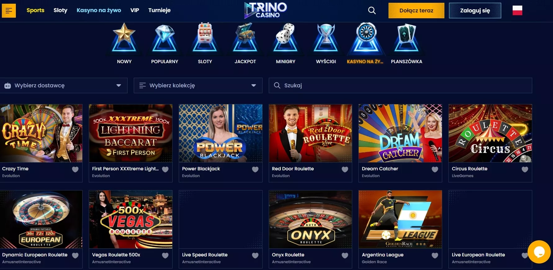 Gry na żywo – blackjack, bakarat, ruletka, kości, pokazy na żywo.
