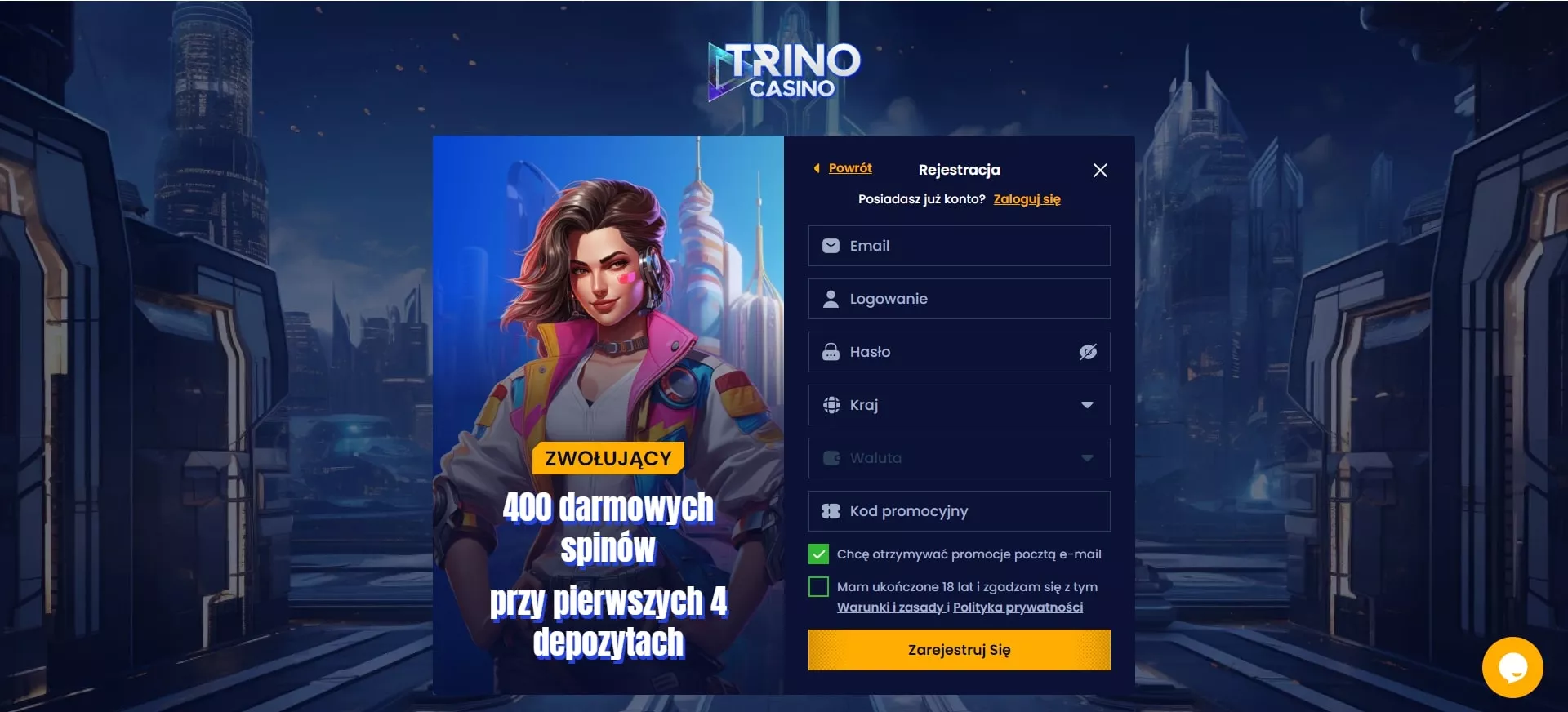 Co zrobić i jak zarejestrować się w kasynie online Trino? Wejście jest dostępne po tym, jak online kasyno potwierdzi rejestrację, którą wykonamy według tej instrukcji: