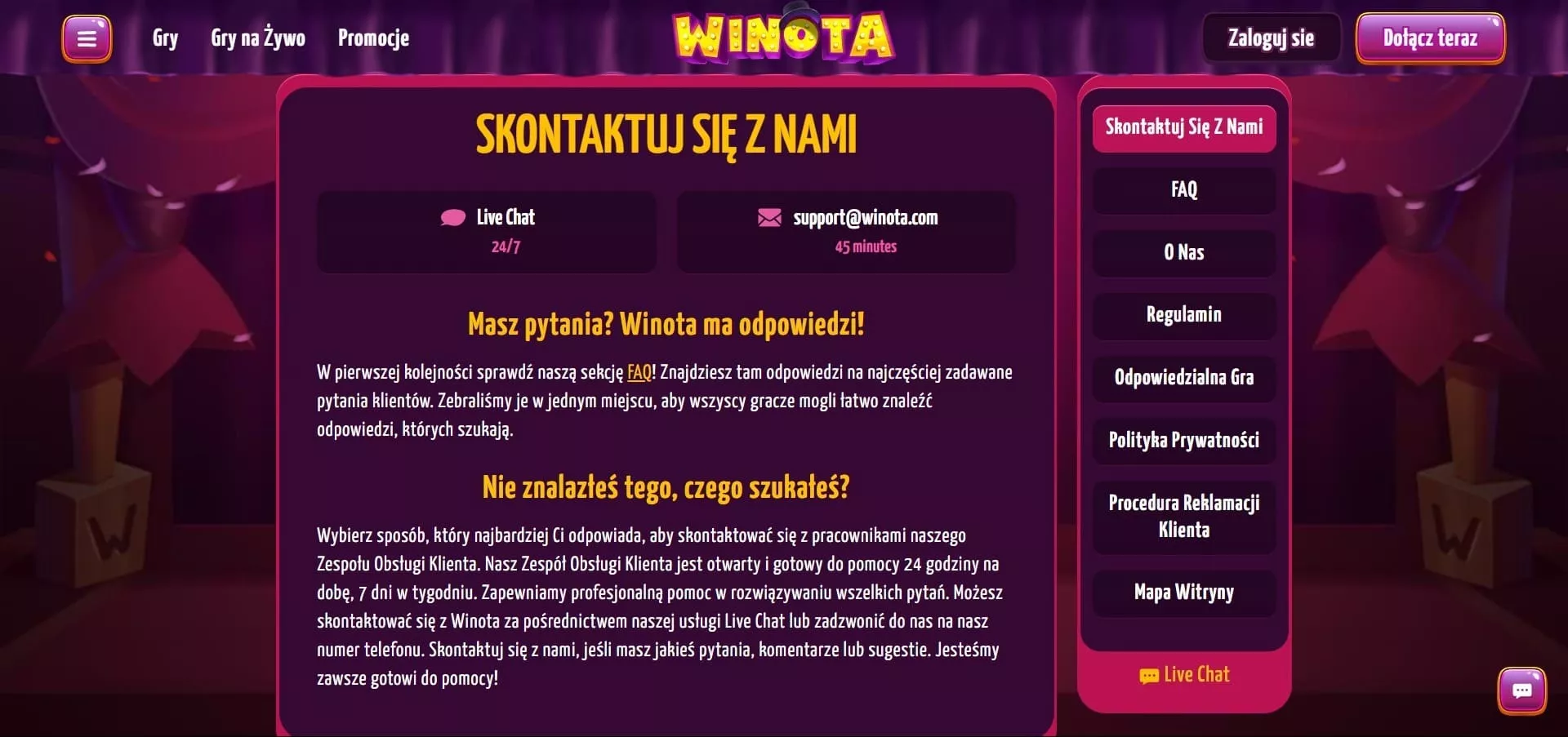 Dobre kasyno, które oferuje wysokiej jakości gry hazardowe swoim klientom, powinno dbać także o jakość swoich usług, a jedną z nich jest profesjonalna i fachowa obsługa klienta. I nie inaczej jest w przypadku omawianego w tej recenzji kasyna internetowego Winota.