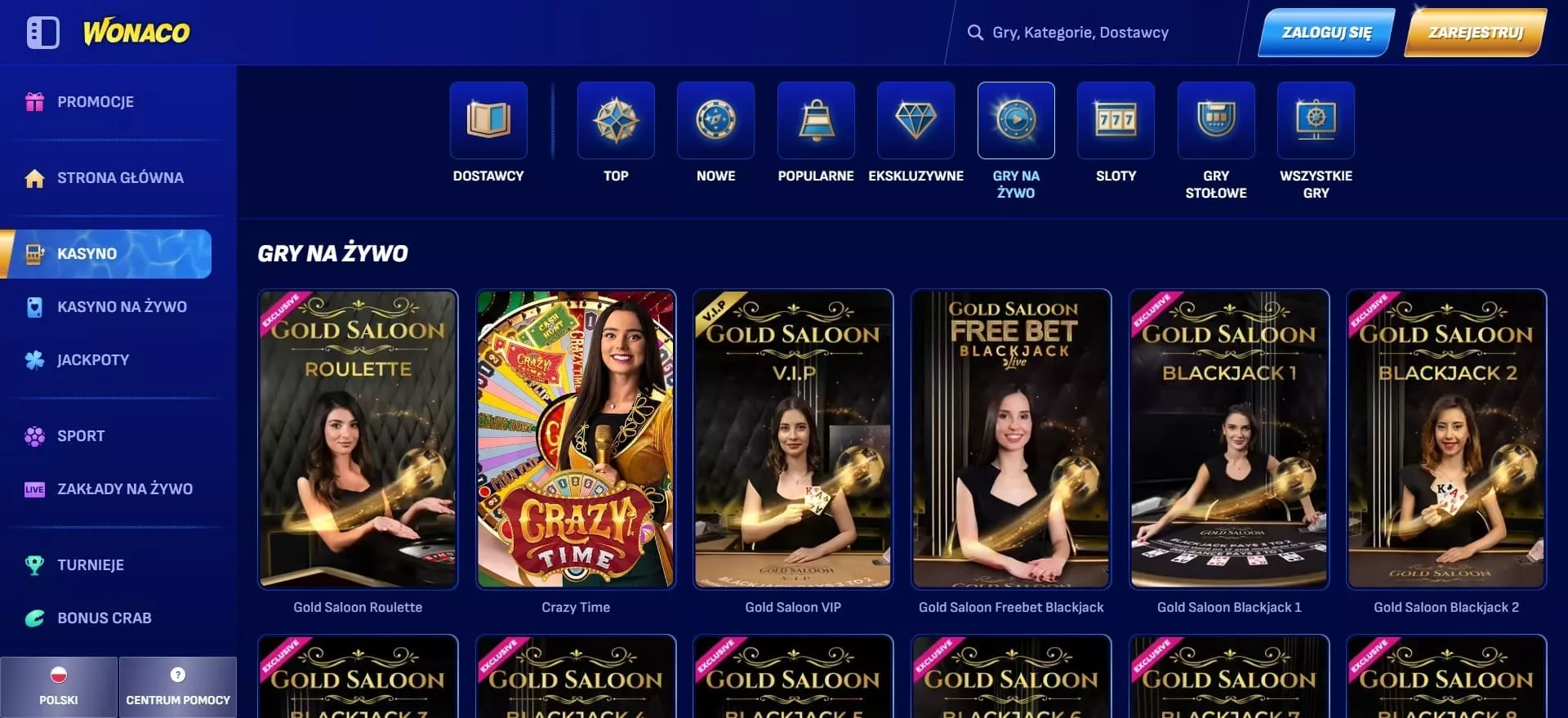 Wonaco posiada jasno wyodrębnione kategorie gier, w których możemy stawiać zakłady. W głównej sekcji znajdują się automaty wideo, zdrapki, bingo oraz gry typu crash – jest ich ponad 8 000. Odrębną zakładkę stanowi kasyno live. Operator w menu po lewej stronie umieścił również jackpoty. Nieco więcej kategorii jest w centralnym lobby.
