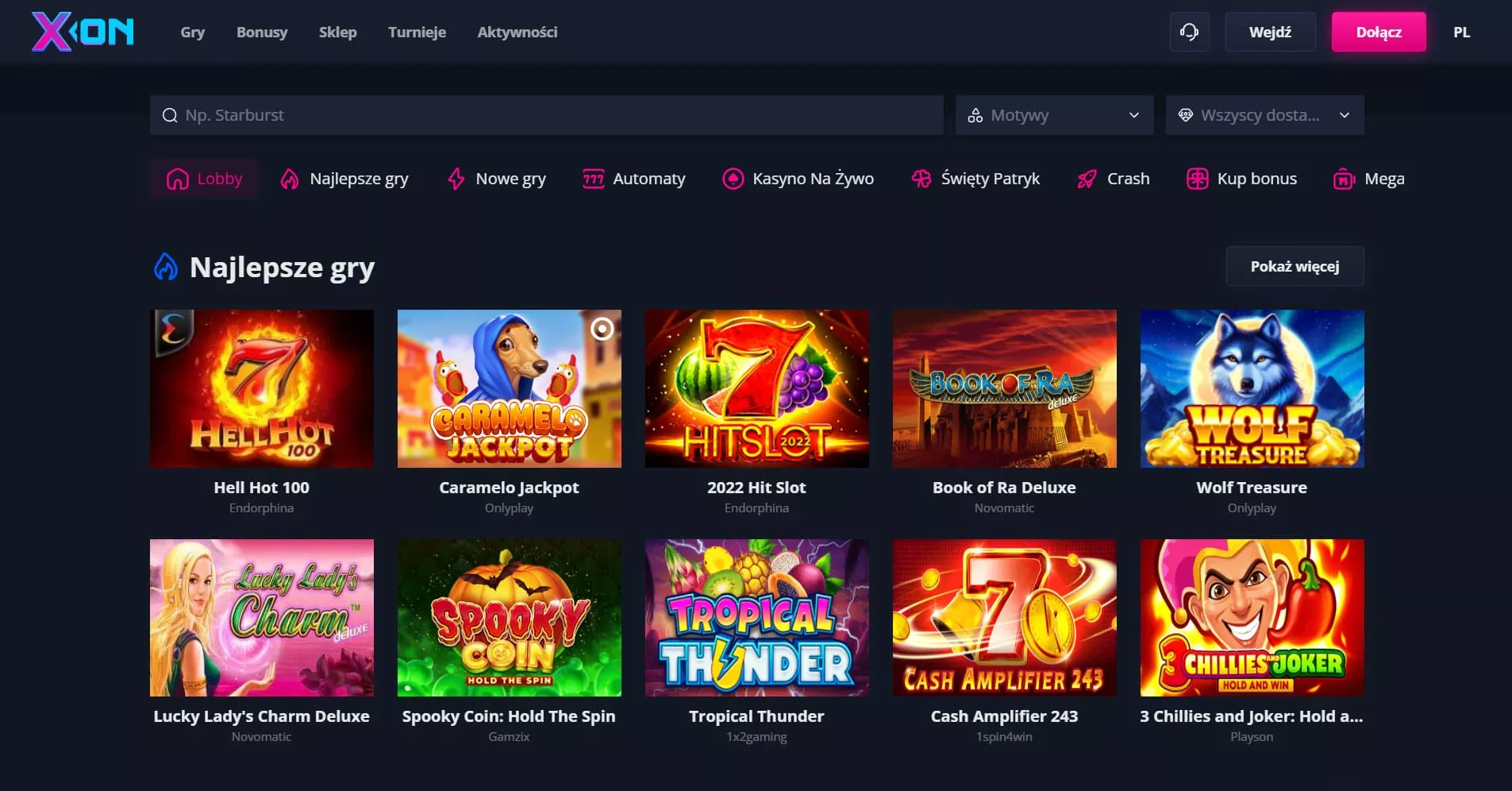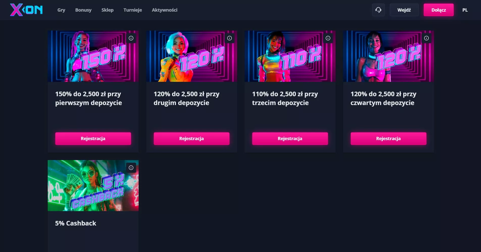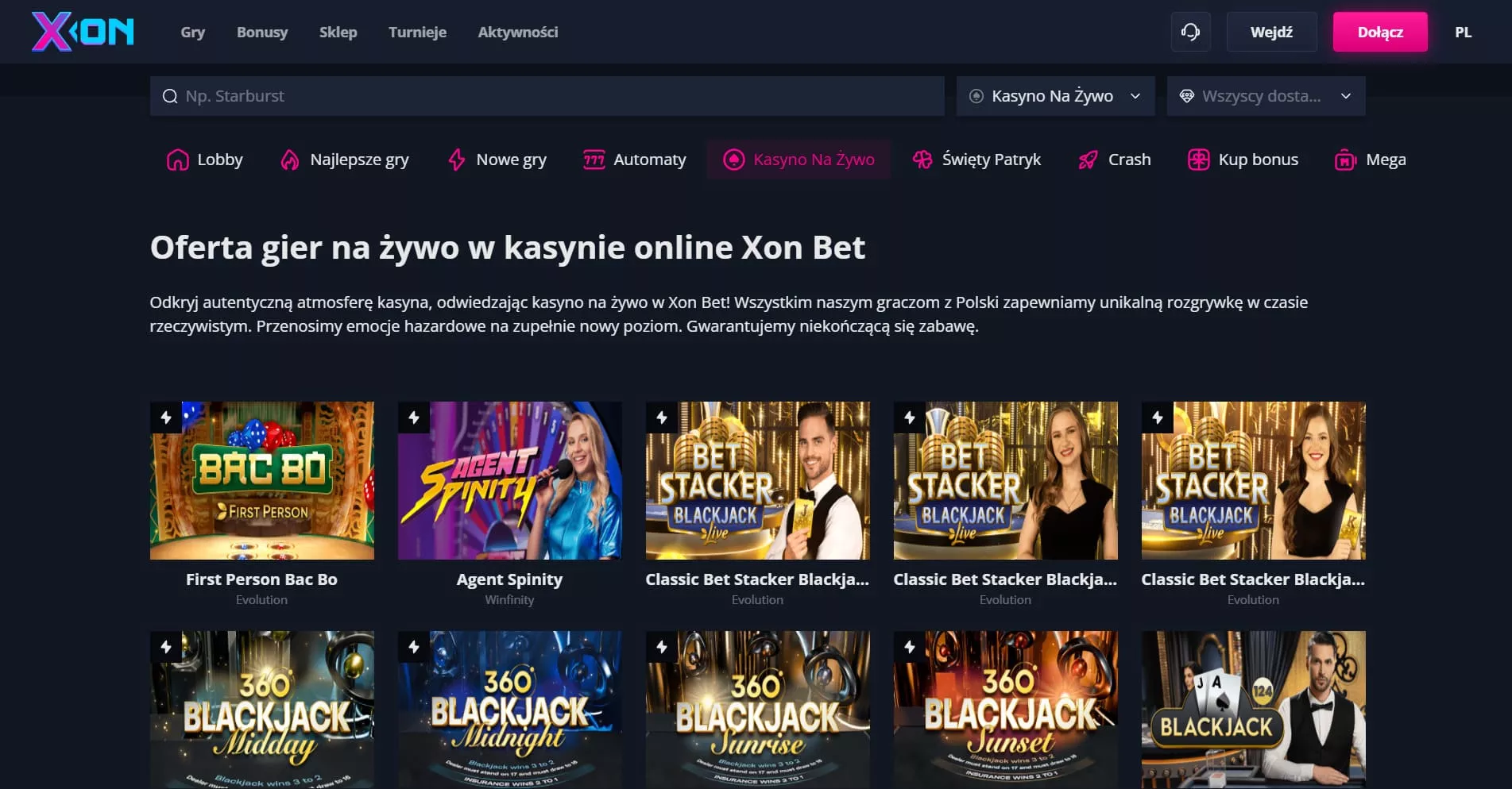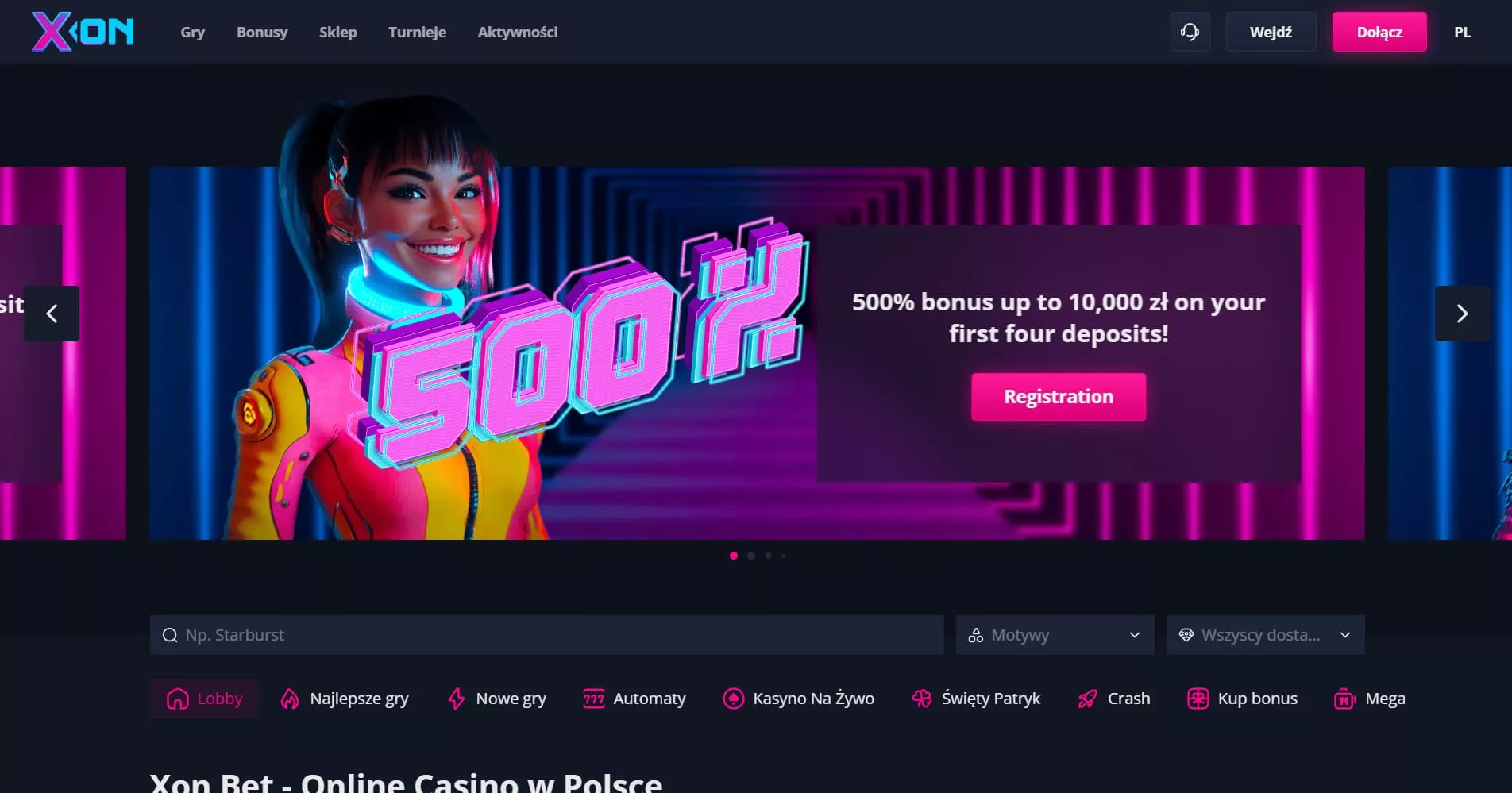 Xon Bet to nowa platforma hazardowa, która w ciągu kilku miesięcy od startu w 2024 roku zgromadzila ponad 4500 tytułów od uznanych dostawców. Kasyno wyróżnia się hojnym pakietem powitalnym o wartości 500% oraz cotygodniowym cashbackiem bez wymagań obrotu dla stałych graczy. Dla polskich graczy przygotowano wsparcie PLN, minimalny depozyt od 25 złotych oraz limity wypłat sięgające 500 000 złotych miesięcznie.