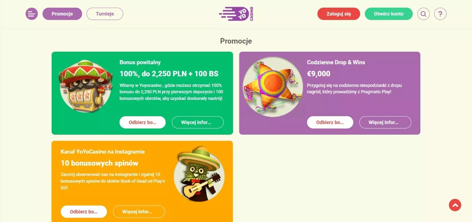 Liczba bonusów w Yoyo Casino sprawia wrażenie, że kasyno dba o ciebie, niezależnie od twojego stażu. Co ważne nie są konieczne żadne kody bonusowe Yoyo Casino. Promocje aktywowane są automatycznie, a w razie problemów możesz skontaktować się z obsługą.