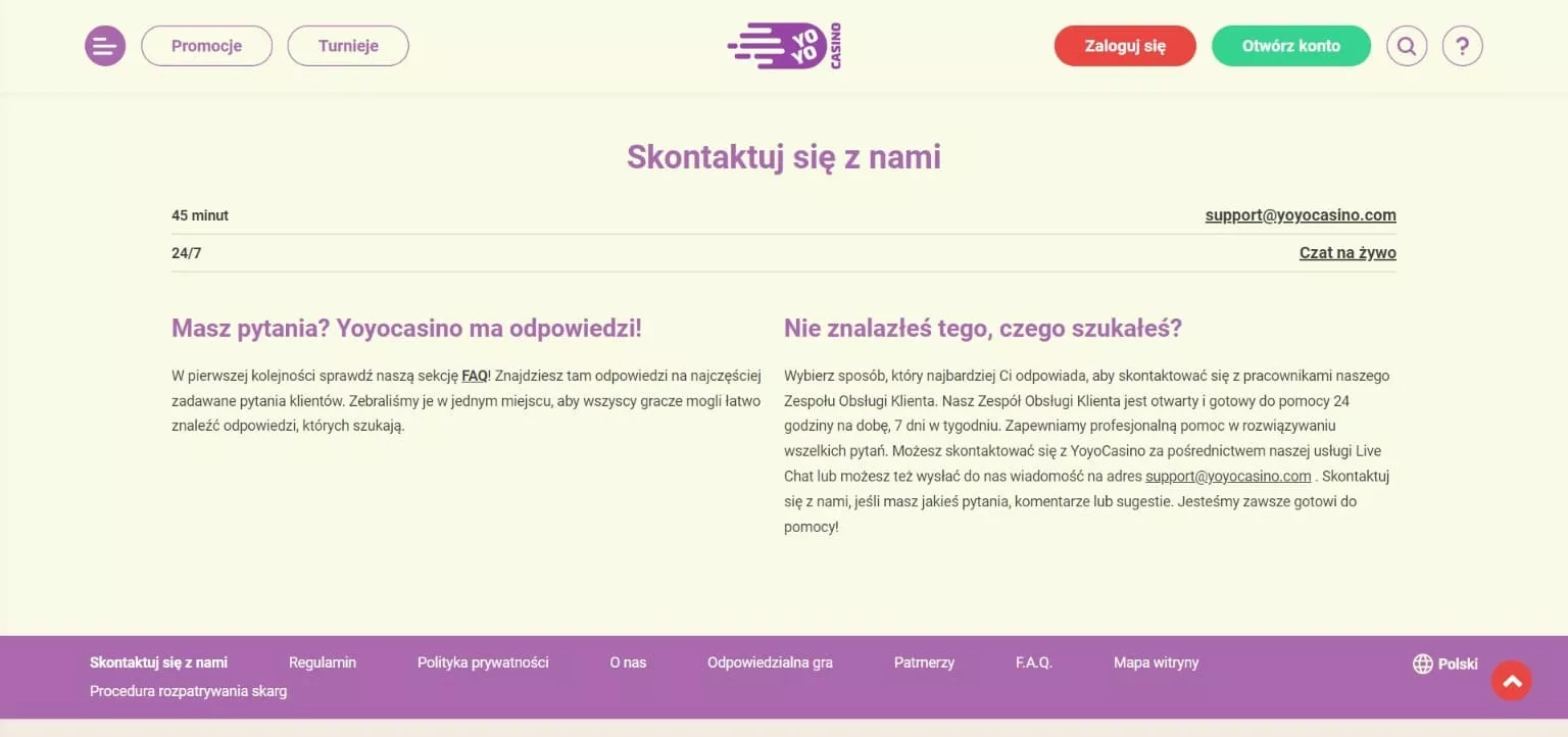 Wiadomość e-mail: support@yoyocasino.com – kasyno gwarantuje odpowiedź na wysłaną wiadomość e-mail nawet do 45 minut.