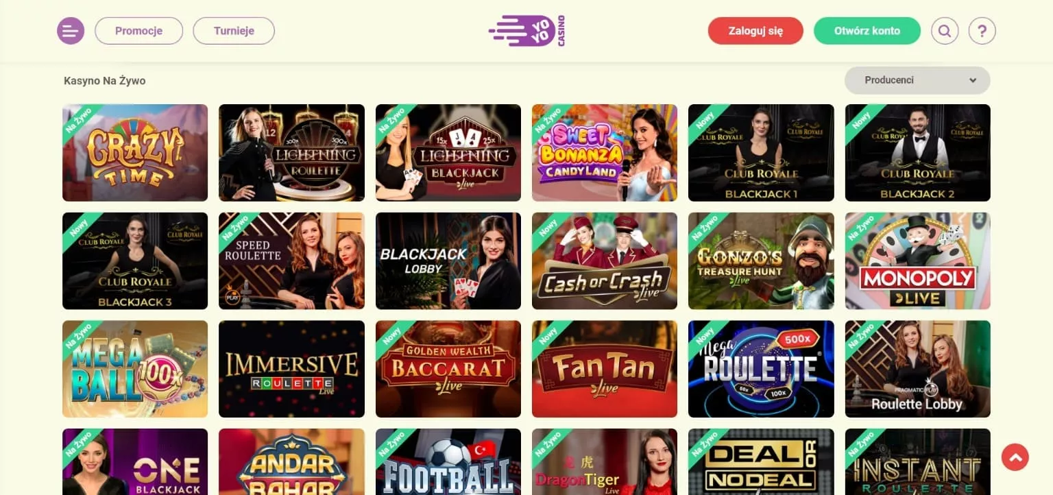 Gry prowadzone przez prawdziwego krupiera na żywo zawsze wzbudzają mnóstwo emocji. W bibliotece gier z prawdziwym krupierem można znaleźć całą gamę najlepszej rozrywki, która przypomina swoim klimatem grę w stacjonarnym kasynie. Są wśród nich zarówno różne opcje ruletki na żywo, w tym Lightning Roulette, blackjack na żywo, bakarat na żywo i poker na żywo, a także wciągające gry teleturnieje, w tym Crazy Time, Monopoly Live, Deal or no Deal, Dream Catcher, Football Studio, Mega Ball czy Cash or Crash.